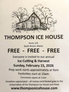 Thompson Ice House Annual Ice Cutting & Harvest 11:00 am – 3:00 pmFebruary 15, 2026 Thompson Ice House1864 ME-129South Bristol, ME 04568View LocationMap Thompson Ice House More information iCal Google Calendar View full calendar